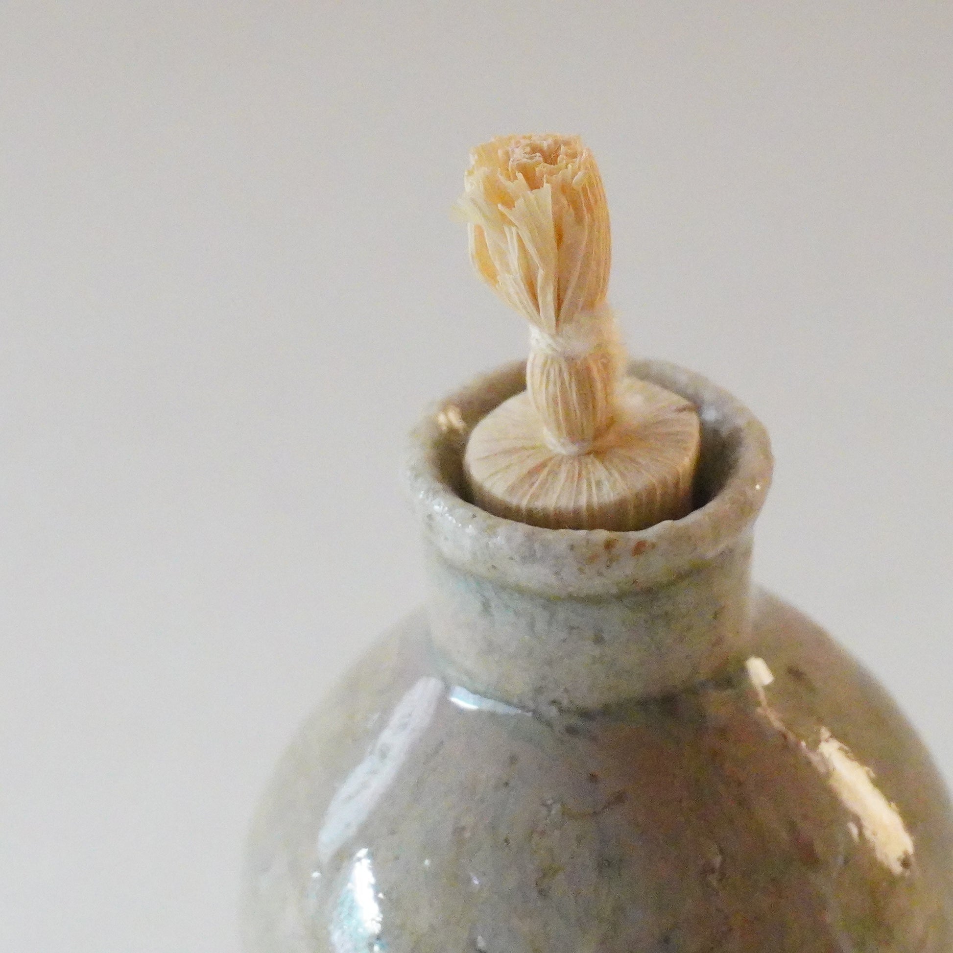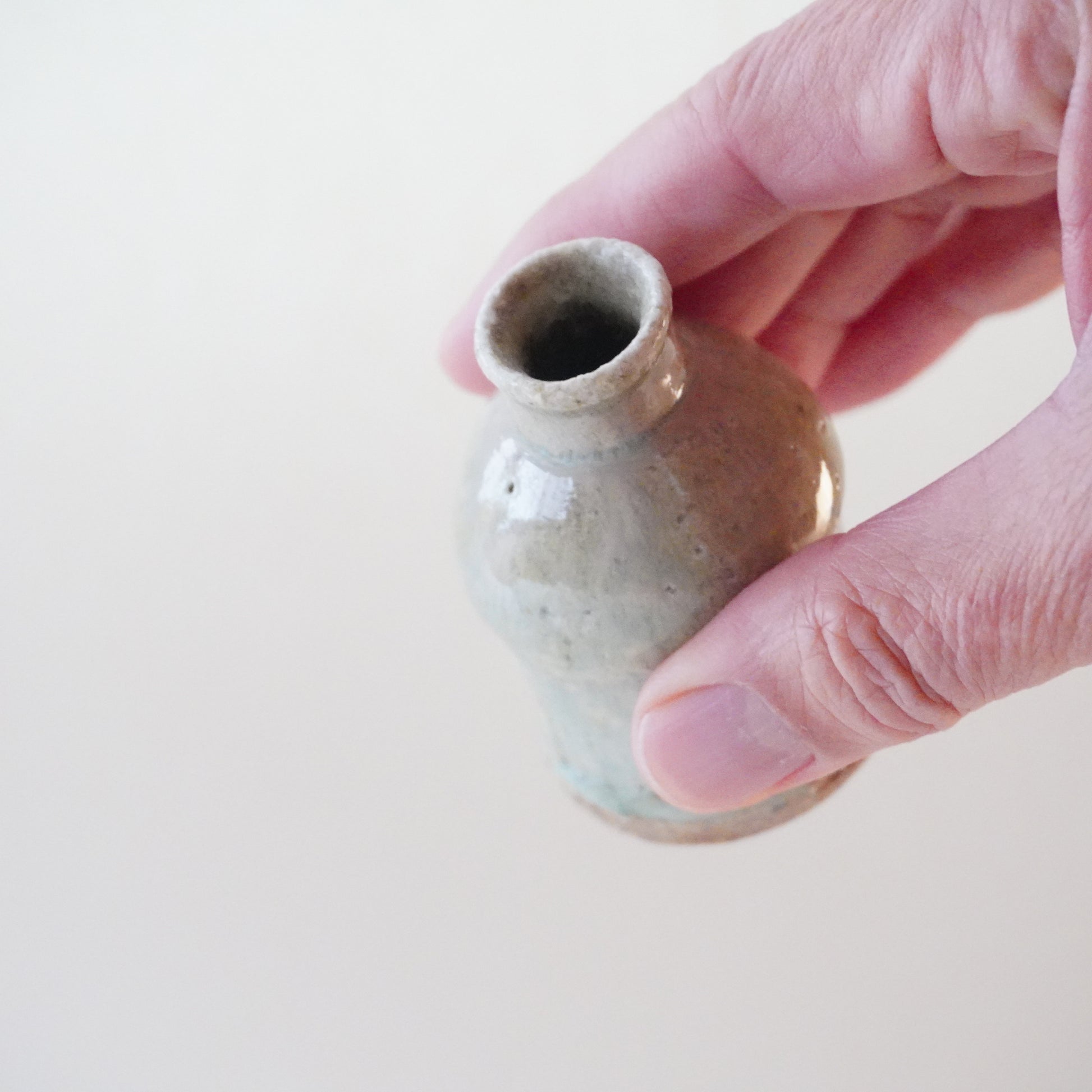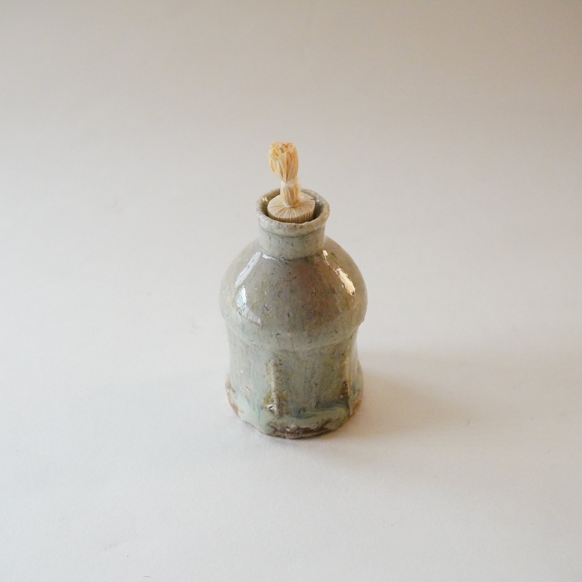 手のひらに収まる小ぶりな姿、口が小さく、蓋のついたかたち。