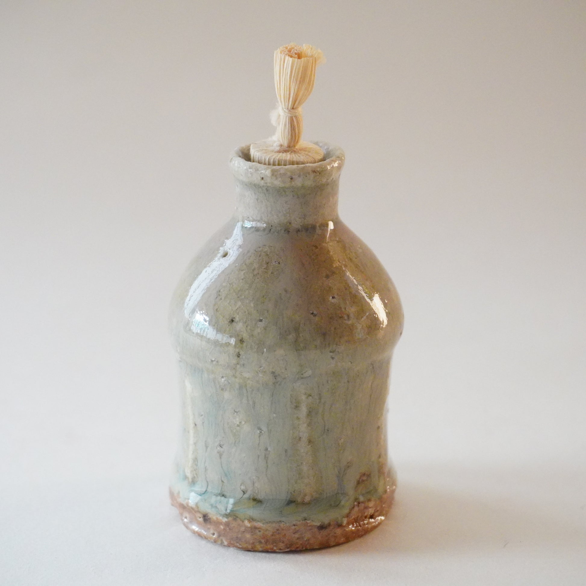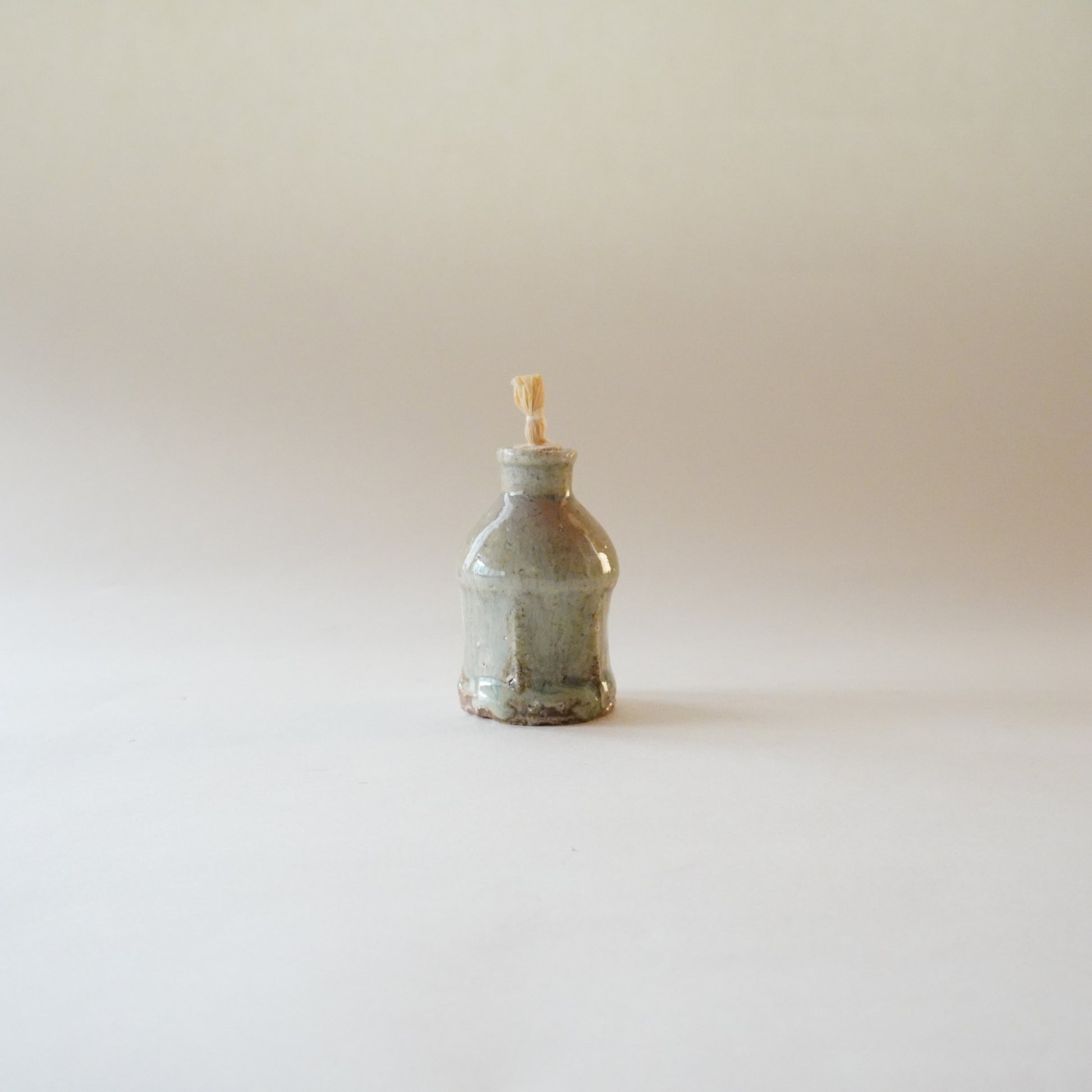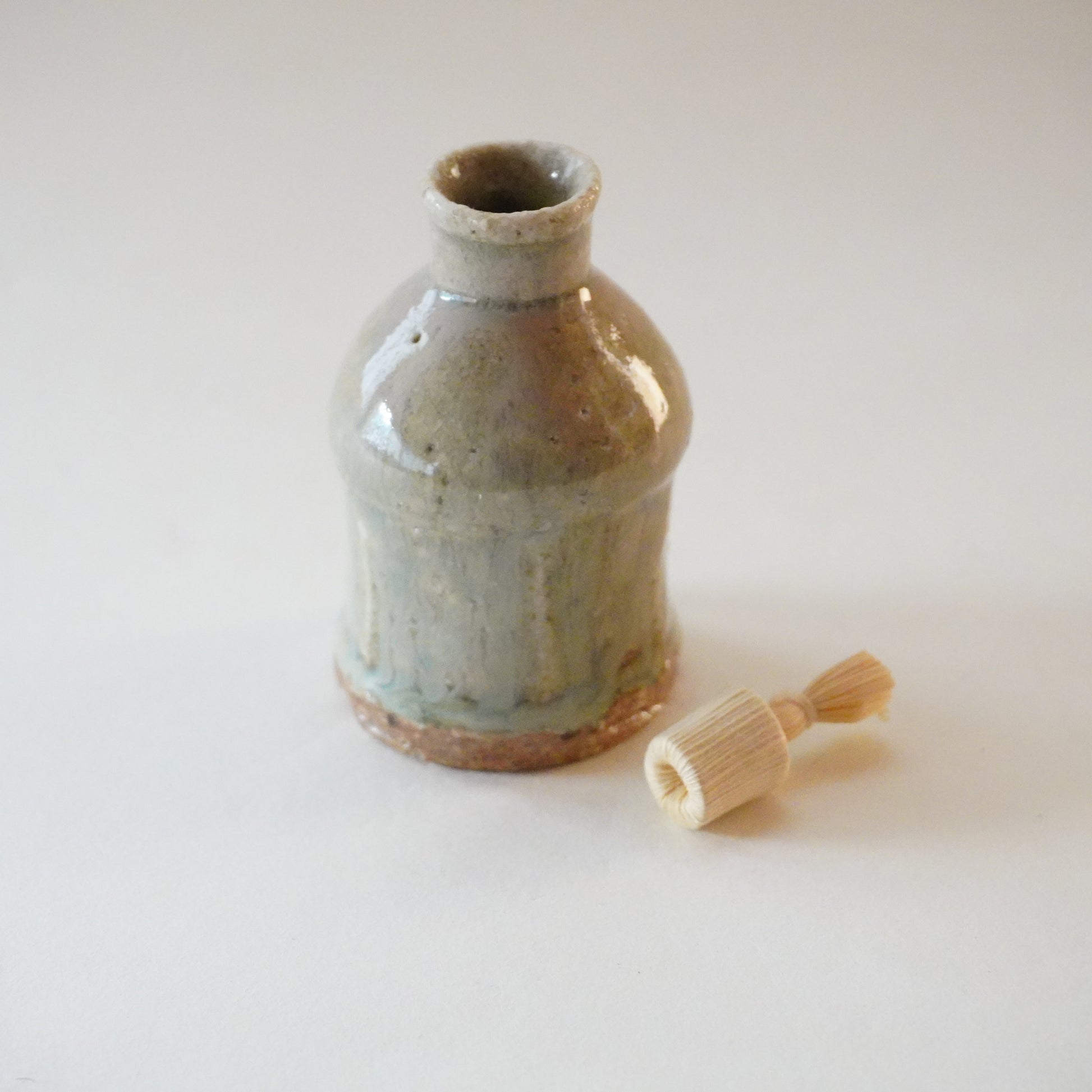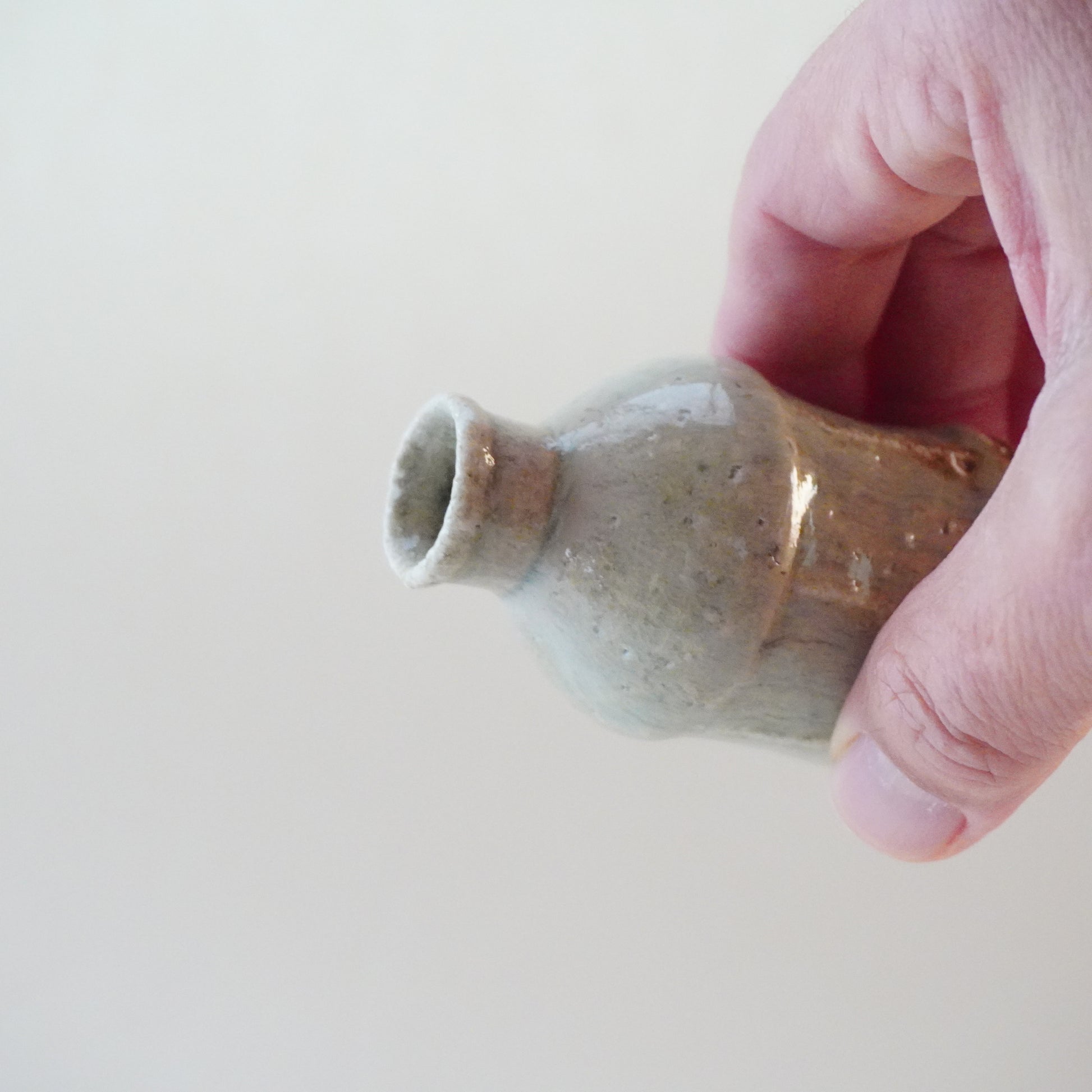 手のひらに収まる小ぶりな姿、口が小さく、蓋のついたかたち。