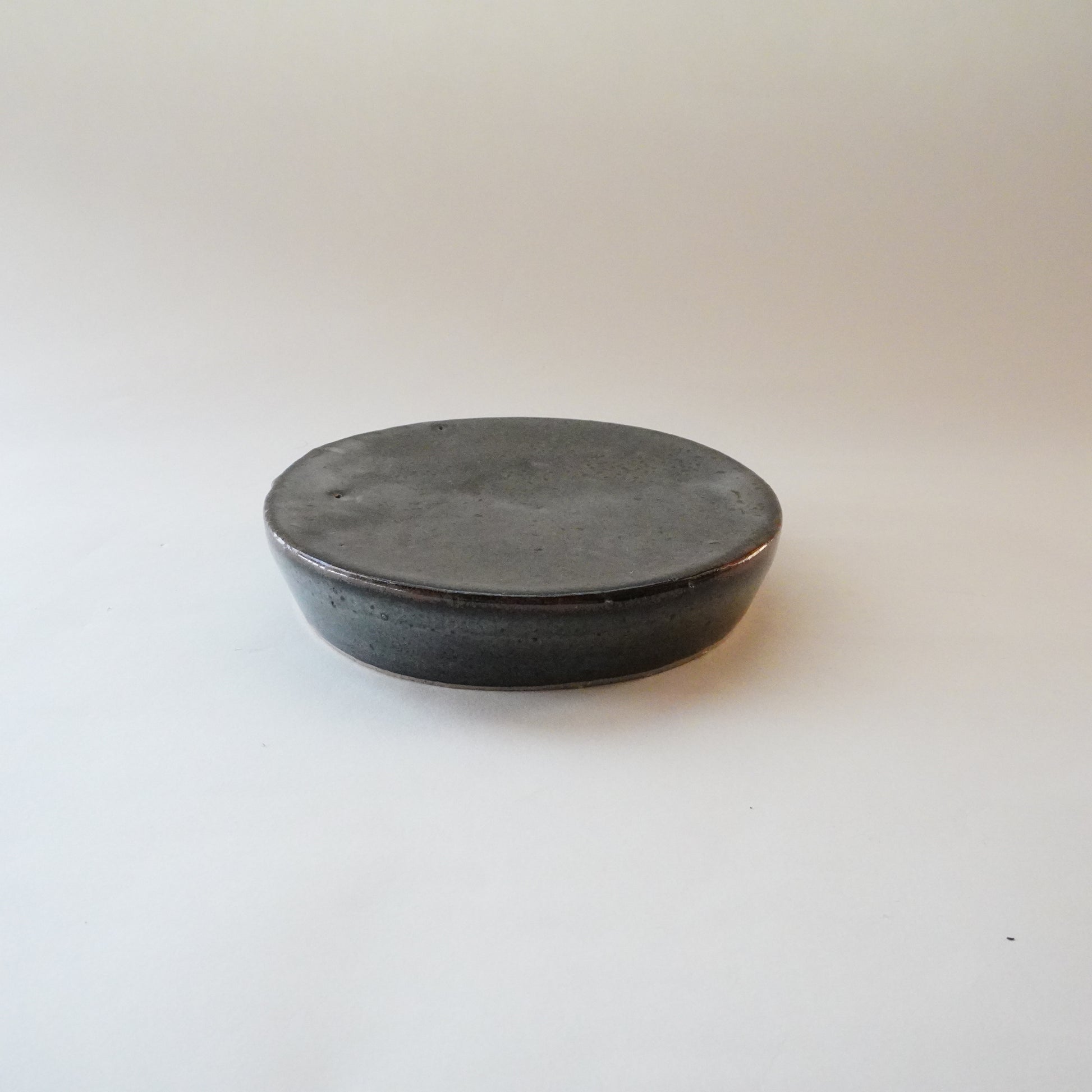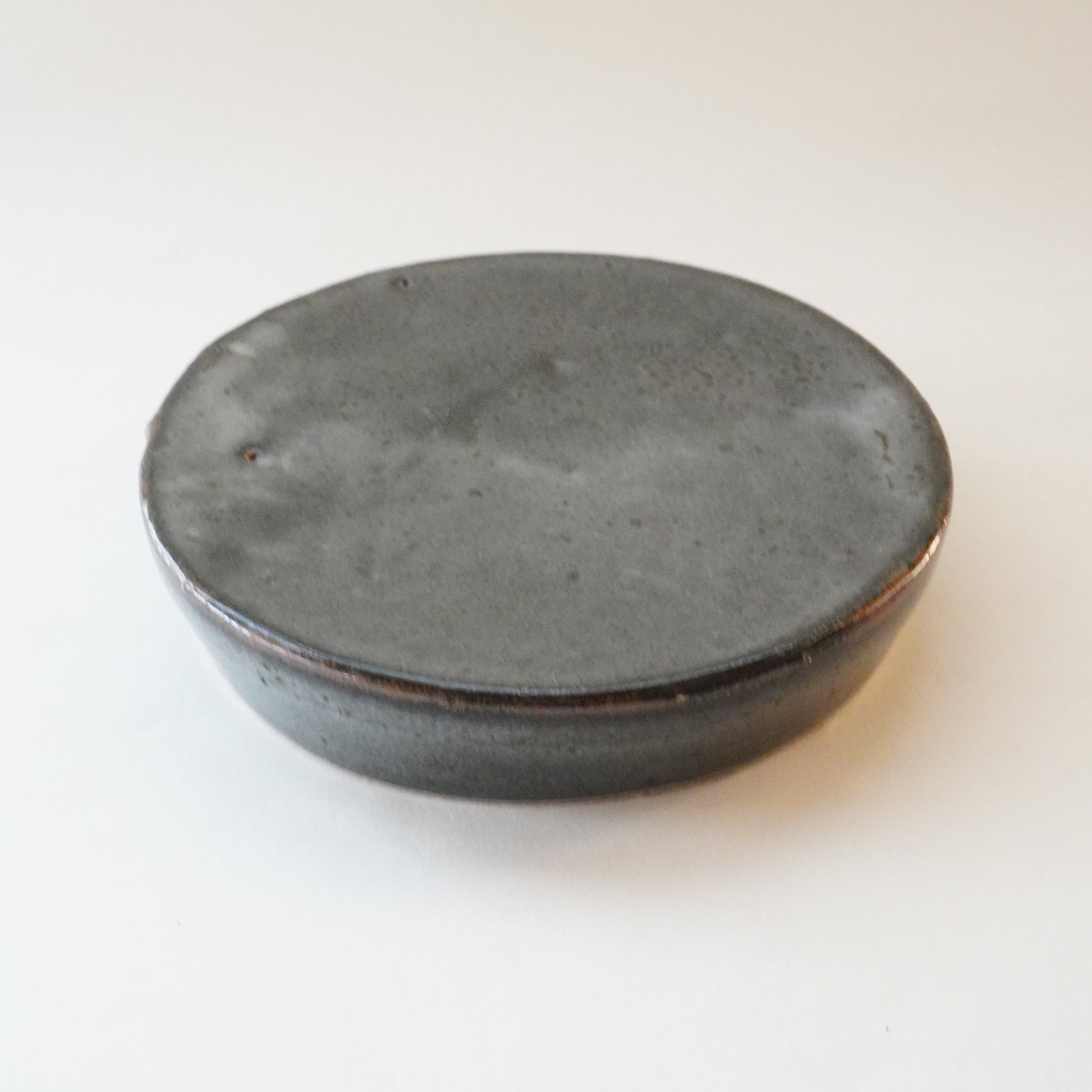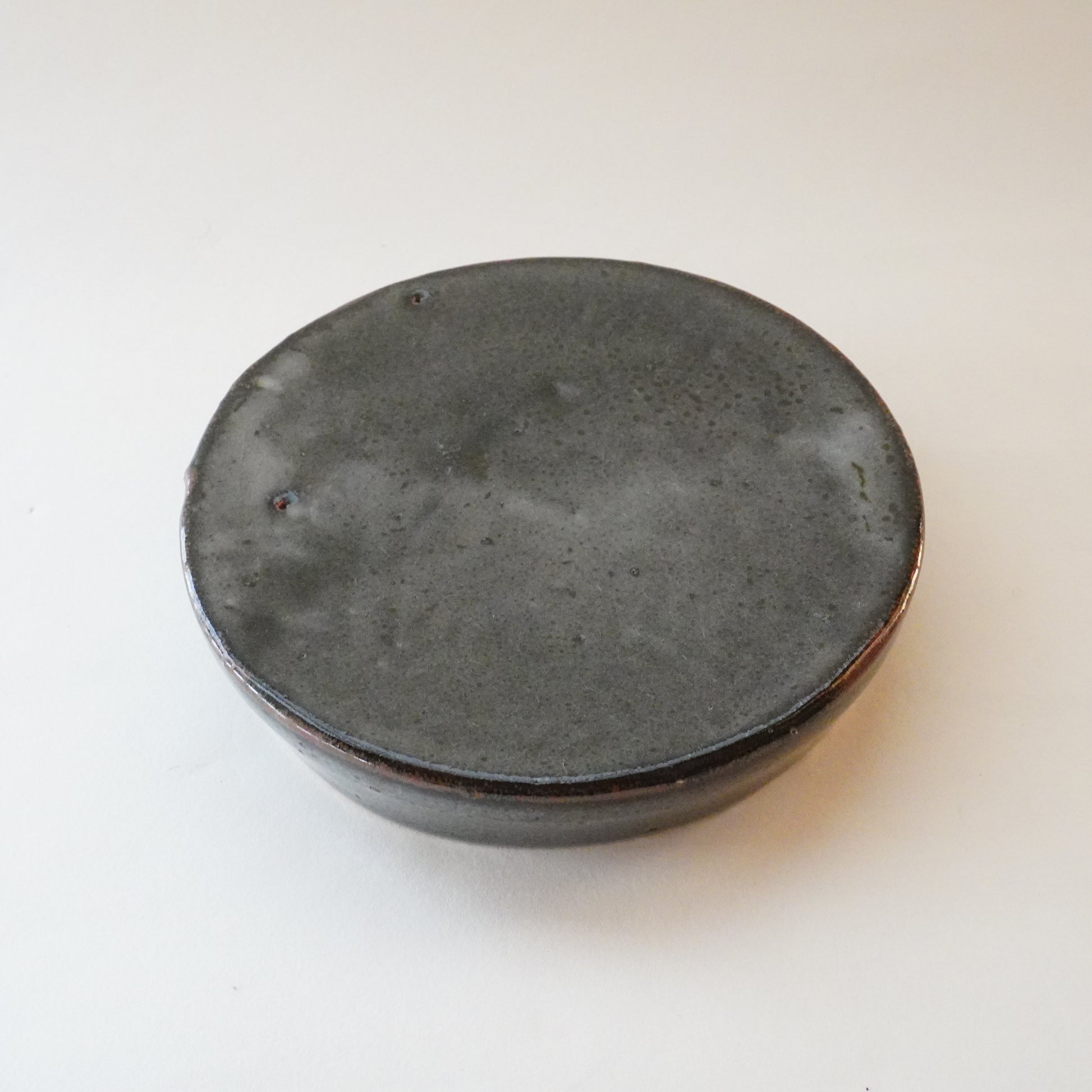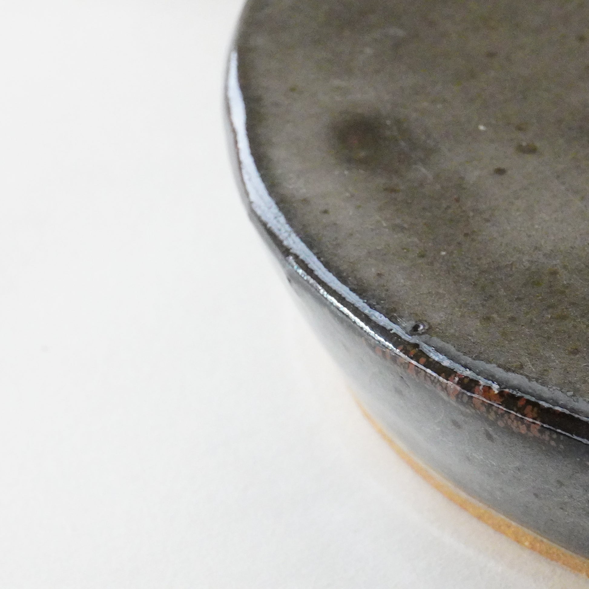 黒や深緑、灰色が重なり合う釉調は、光の加減によって、艶やかにも、沈んだ色合いにも見え、見る角度ごとに印象が変わります。