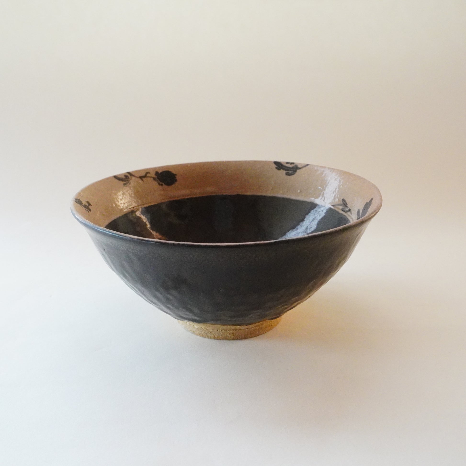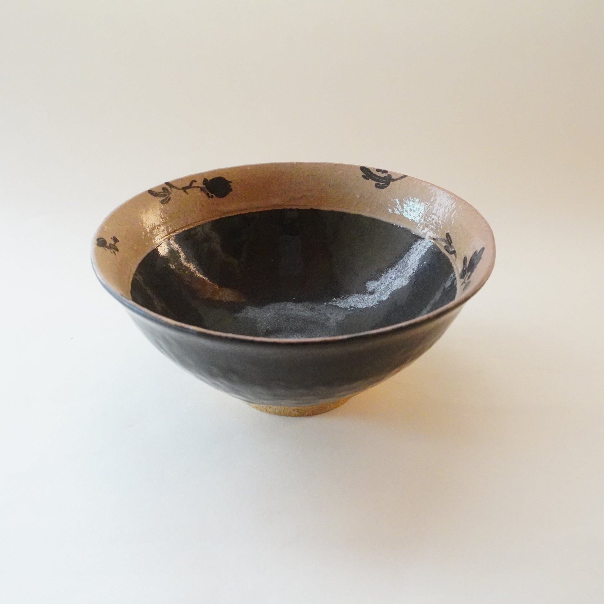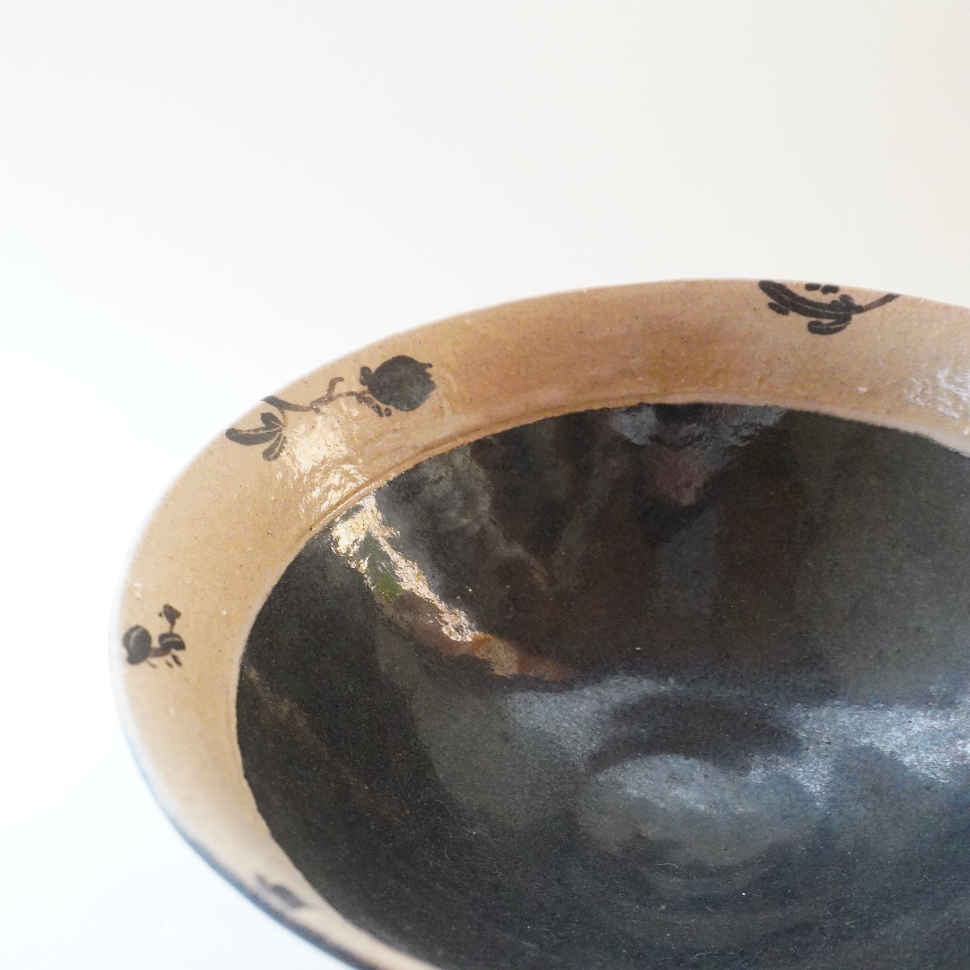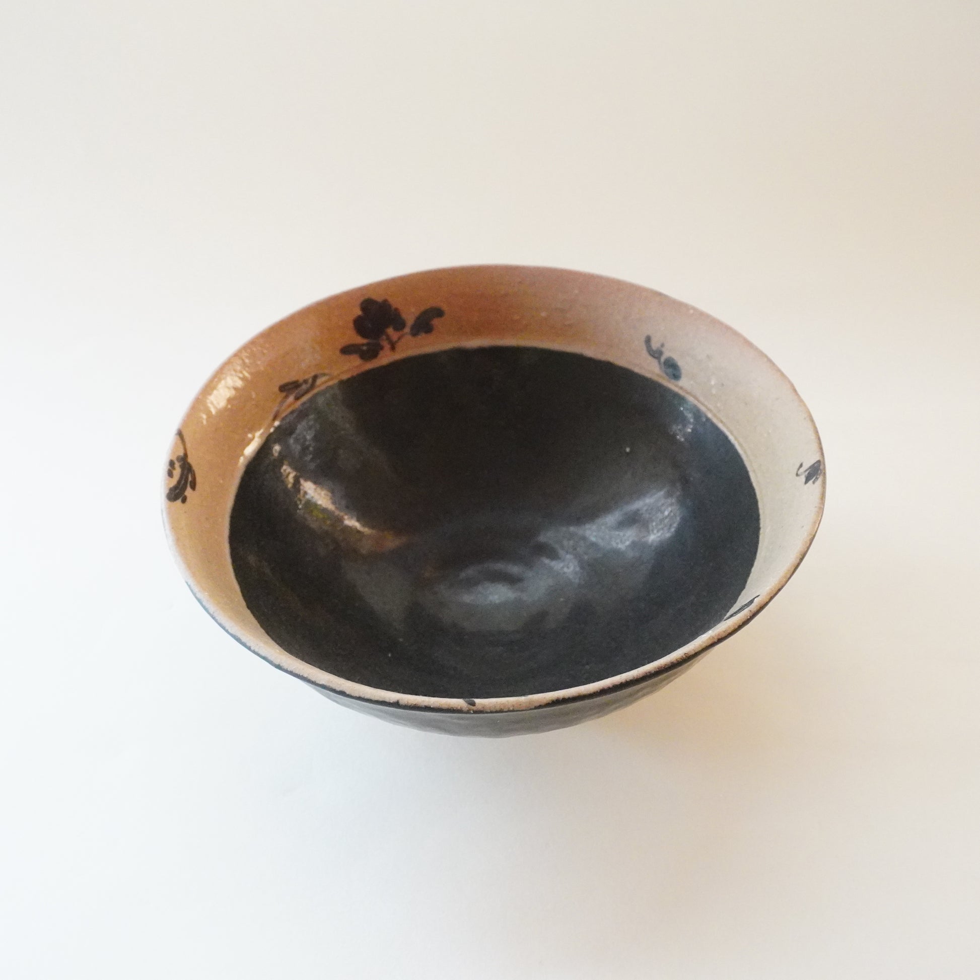 内側に描かれた黒絵が印象的な、黒絵唐津の鉢です。